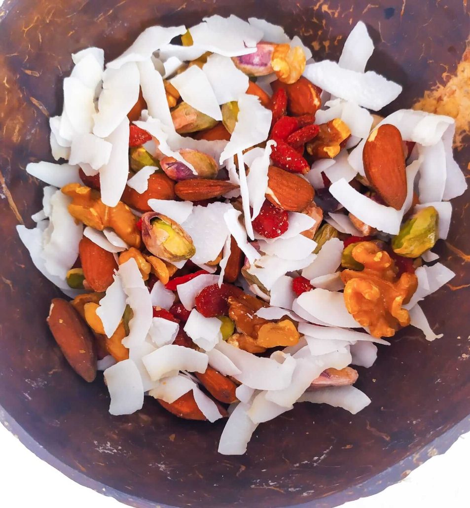 Questo nome è stato inventato per indicare un mix di frutta secca che si può mangiare come spuntino a metà mattina o metà pomeriggio.