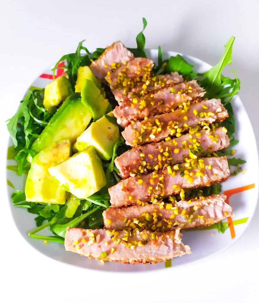 Una volta cotto, adagia il tonno sul tagliere e fai delle fettine. Disponi le fettine sul letto di rucola e avocado, cospargi con granella di pistacchi e salsa di soia q.b.