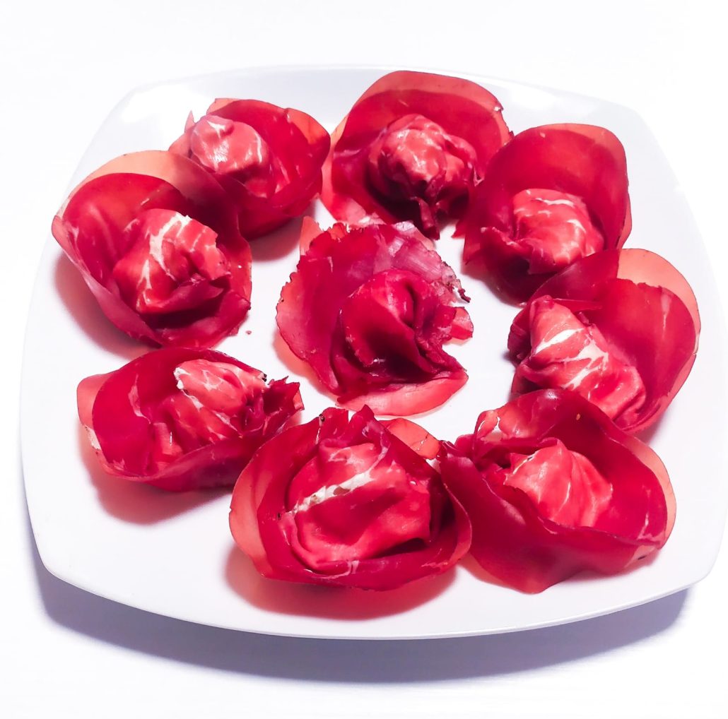 Disponi un cucchiaino di formaggio alle erbe su di una fetta di bresaola e chiudi come se fosse un tortello. Condisci con rucola, grana a scaglie e limone.