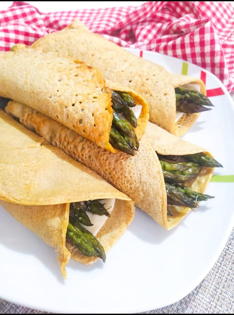 Cosa fai quando ti regalano due mazzolini di asparagi? Guardando in frigo e nella credenza le farine che avevo cominciato, ho pensato a questa ricetta. Il wrap è una sorta di tortilla o piadina molto sottile arrotolata e farcita.